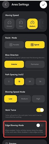 Note: The toggle cannot be adjusted while a work plan is in progress, paused, or when Yarbo is returning for recharging.