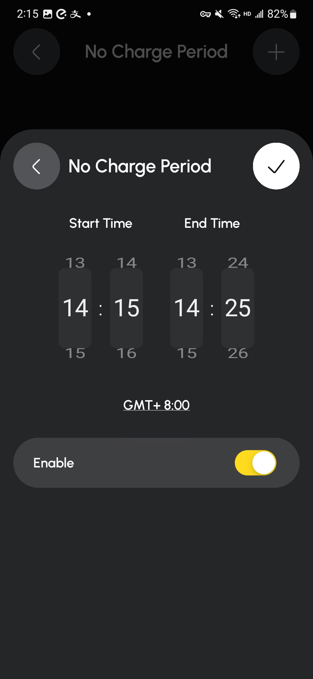 You can set daily non-charging periods in the app (e.g., 17:00–20:00). The minimum interval is 10 minutes, and the feature is disabled by default.