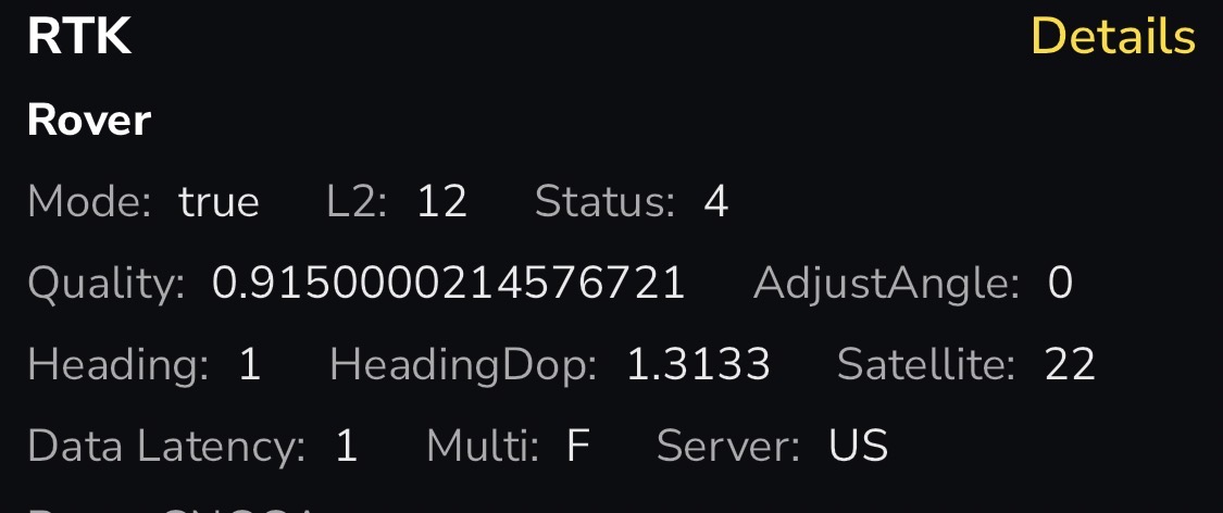 All sounds good. If you rebooted everything, does your DC CNR values look OK? You can throw it in survey mode by clicking details under the RTK section of the diagnostics. You need CNR values for most of the constellations to be around 36 or higher.
