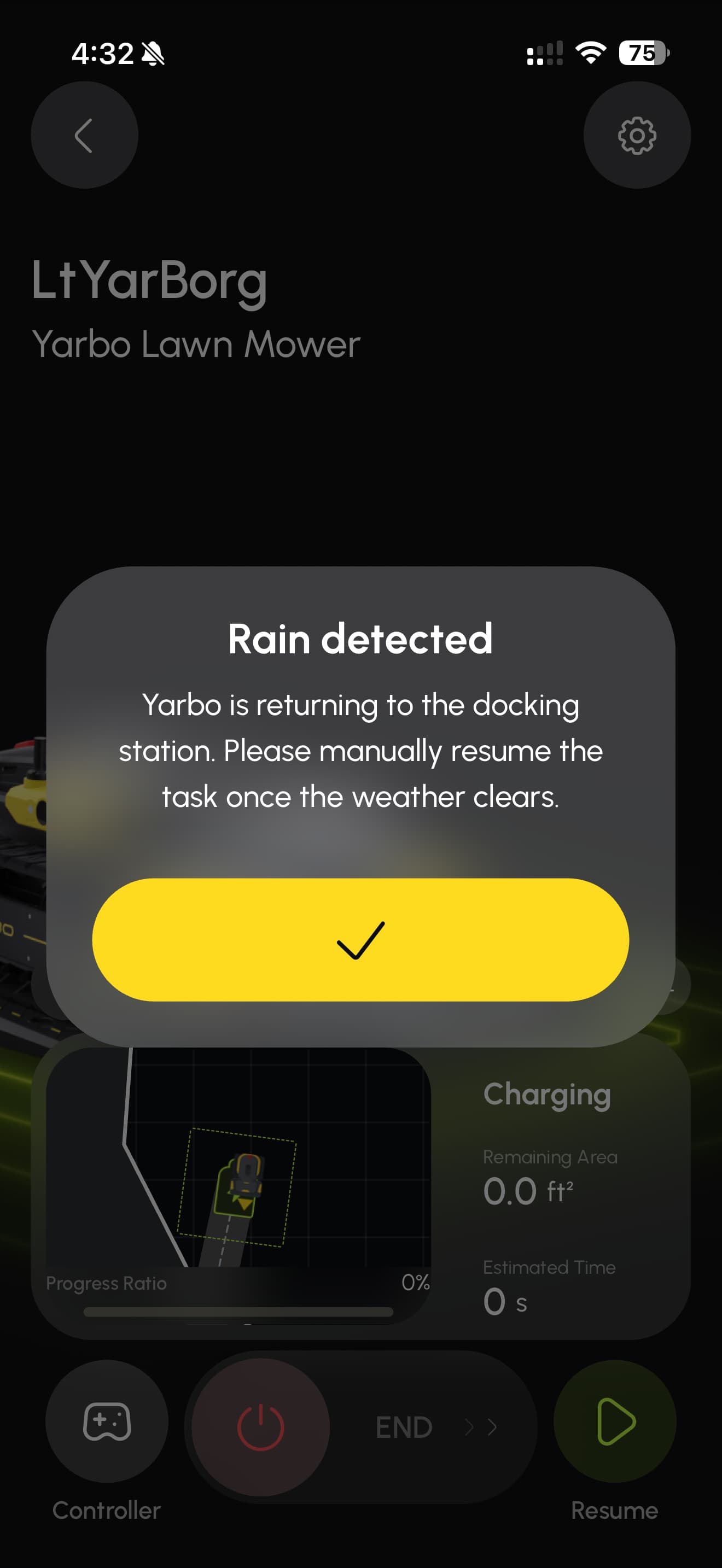 Again, communication… How can we know by just looking in the app? A small info button to let us know that they did not implement auto-resume would be nice! We don’t even receive a notification that it goes park…